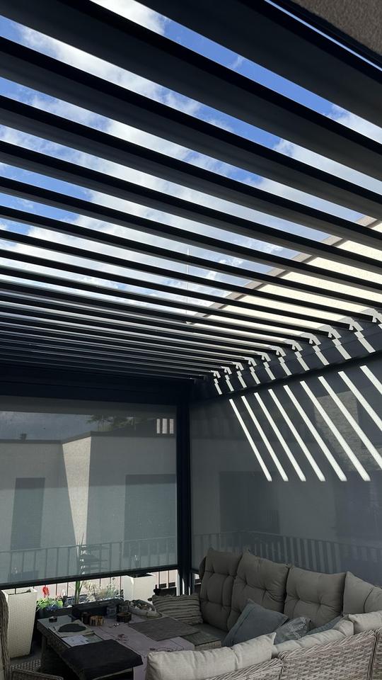 Der große Hauptbalkon hat eine elektrische Bedachung mit seitlichen Sonnenschutzwänden. Dach und Sonnenschutzwände lassen sich per Fernbedienung öffnen bzw. schließen. Die Bedachung ist Regen/Winterfest.