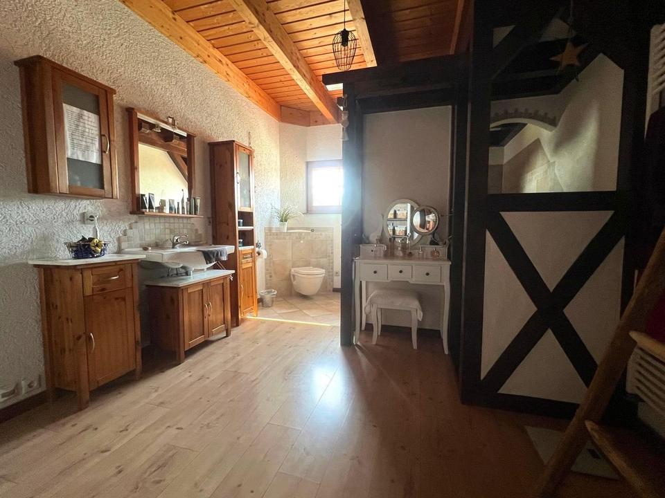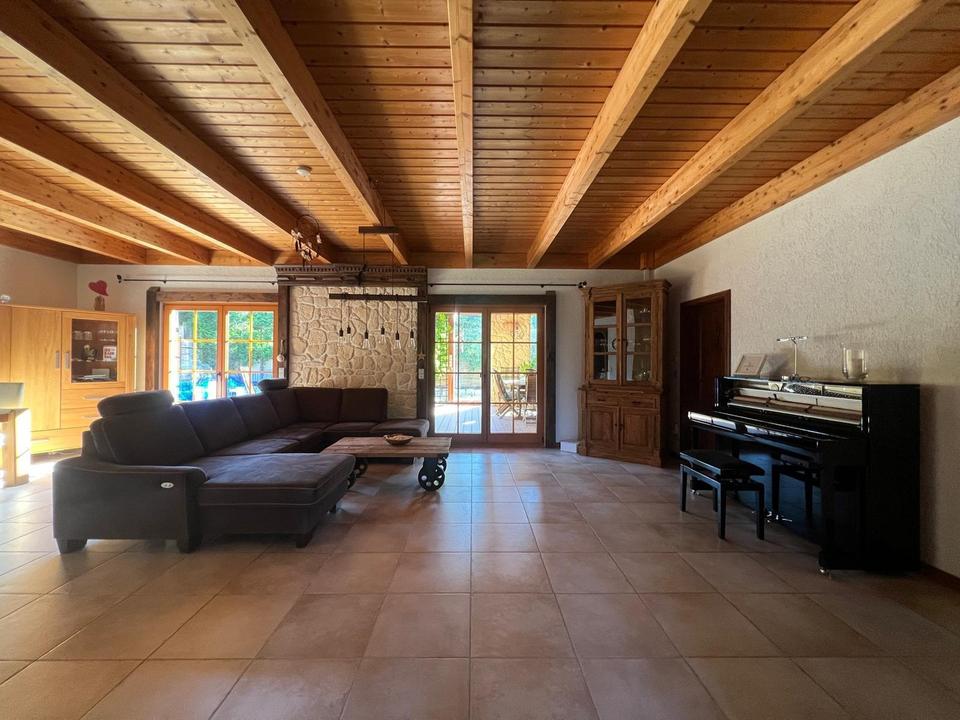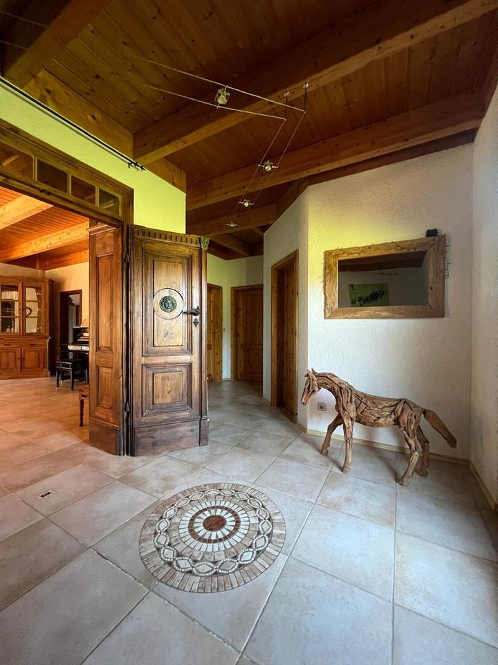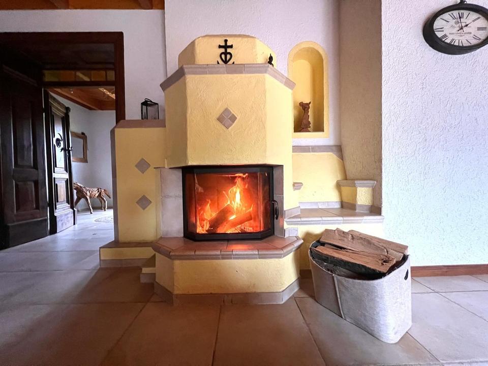 Bereits der Eingangsbereich beeindruckt mit seiner doppelflügeligen, massiv beschlagenen, antiken Tür, die direkt in den großzügigen Wohn- und Essbereich führt. Ein wunderschöner Kachelofen sorgt dort für behagliche Wärme und macht diesen Raum zum Herzstück des Hauses.