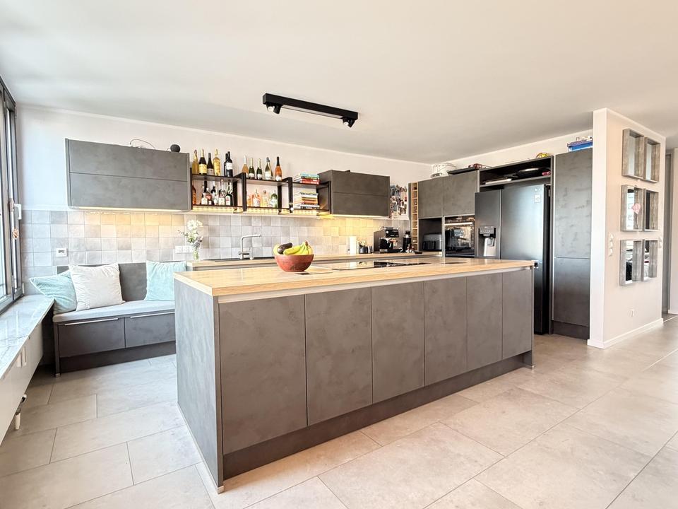 Diese exklusive Maisonette-Wohnung bietet rund 178 m² Wohnfläche auf zwei hochwertig gestalteten Etagen und verbindet großzügiges Wohnen mit besonderem Komfort. Fünf helle Zimmer, zwei moderne Bäder sowie ein separates Gäste-WC schaffen ideale Voraussetzungen für qualitatives und anspruchsvolles Wohnen. Durch große Aluminium-Fensterfronten ist die Wohnung lichtdurchflutet und präsentiert sich mit einer großzügigen, offen und modern gestalteten Küche mit Kochinsel in einem zeitlosen Wohnambiente.