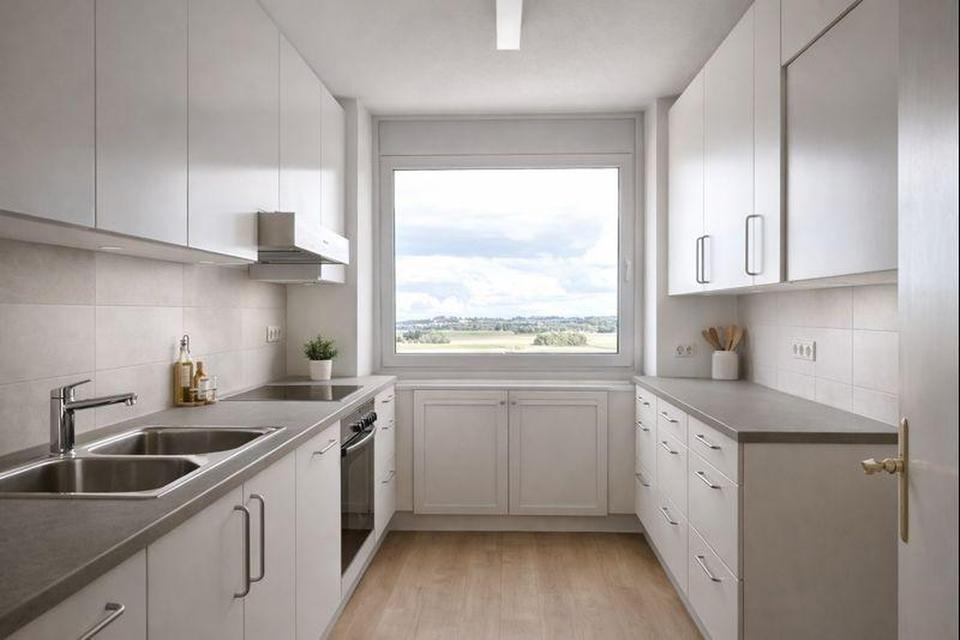 Der Wohnbereich bietet ausreichend Platz für einen Wohn- und Essbereich und verfügt über einen direkten Zugang zum Balkon, von dem aus sich ein weiter Blick über die Umgebung eröffnet. Die Küche ist funktional angeordnet und bietet vielfältige Gestaltungsmöglichkeiten.