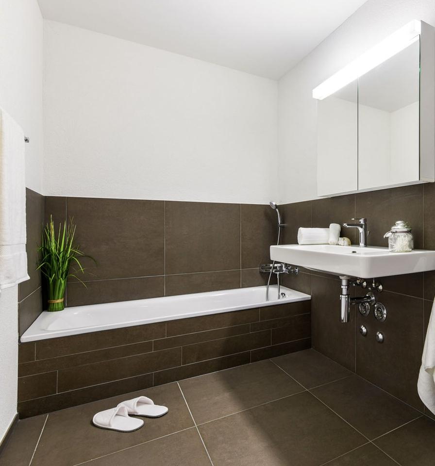 Das innenliegende Badezimmer ist mit einer Badewanne und einem Waschbecken ausgestattet. Ein separates WC sorgt für zusätzlichen Komfort. Waschmaschinen- und Trockneranschlüsse befinden sich ebenfalls im Badezimmer.