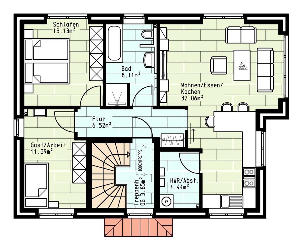 Die Wohnung im Obergeschoß, welches nicht von Schrägen beeinträchtigt wird, verfügt über 1 Kinder- oder Arbeitszimmer, ein Schlafzimmer sowie ein weiteres Duschbad. Abstellmöglichkeiten bieten der Spitzboden und ein eigener Hauswirtschaftsraum in der Wohnung.