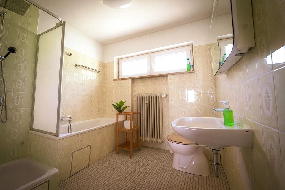 Das Bad ist im Originalzustand der 70er – funktional, aber sicher ein guter Punkt für eine Renovierung nach eigenen Vorstellungen.