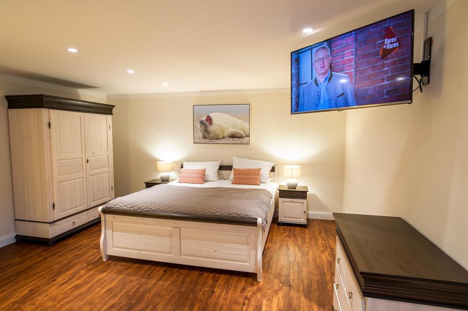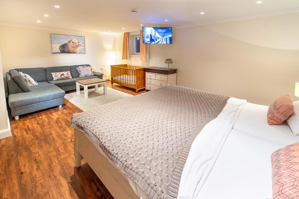 Auf den vier Wohnebenen befinden sich sechs Schlafzimmer, die insgesamt für bis zu 12 Personen Platz bieten. Die Dachgeschoss- und Souterrainzimmer sind jeweils getrennt von den vier Schlafzimmern im Obergeschoss.