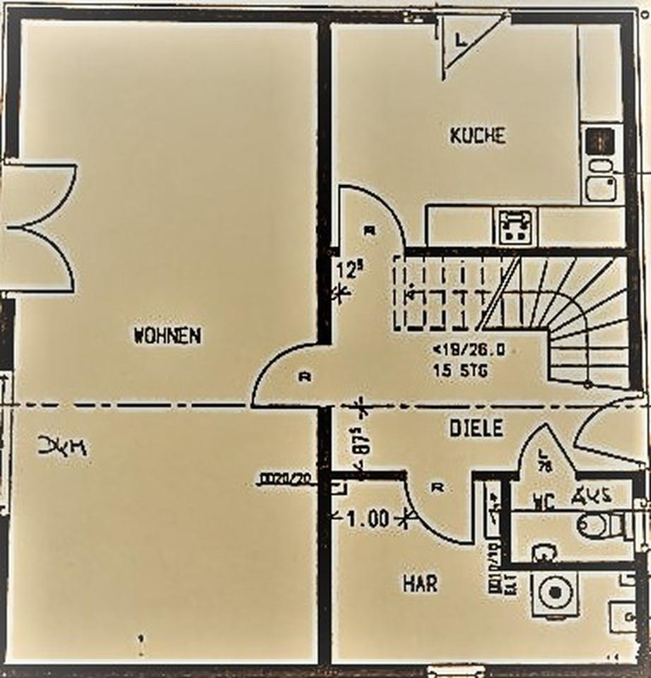 EG: Die beigen Fliesen in moderner Betonoptik wurden neu verlegt und ergeben ein harmonisches Bild in Flur, Küche, Gäste-WC und Duschraum. Es gibt eine separate Küche mit einer sehr praktischen einflügeligen Tür zu der überdachten Terrasse im Hinterhof, ideal für ein Frühstück im Freien. Das Wohnzimmer beeindruckt mit einer Größe von 36 qm, die großen Fenster und zweiflügelige Tür zum Hof sorgen für eine offene und zugleich gemütliche Atmosphäre.