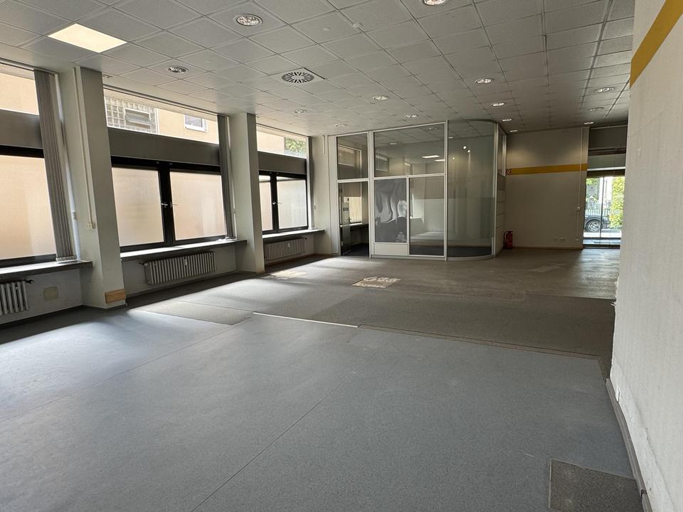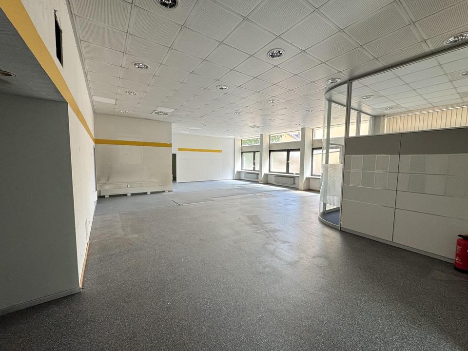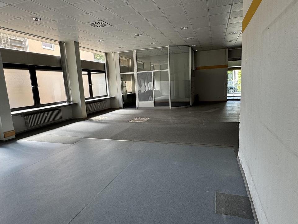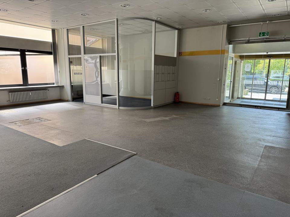 Diese attraktive Gewerbefläche im Erdgeschoss eines markanten Gebäudes in Innenstadtlage von Neustadt an der Aisch bietet auf ca. 290 m² eine offene, flexibel nutzbare Fläche, die sich hervorragend für unterschiedlichste Nutzungskonzepte eignet. Die Fläche wurde über Jahrzehnte als Bankfiliale genutzt und ist nun bereit für eine neue Nutzung. Der repräsentative Eingangsbereich mit elektrischen Glastüren und Windfang schafft einen professionellen Empfang. Innen bietet die Fläche viel Tageslicht, eine überdurchschnittliche Deckenhöhe und einen flexiblen Grundriss – optimal für individuelle Gestaltungen.