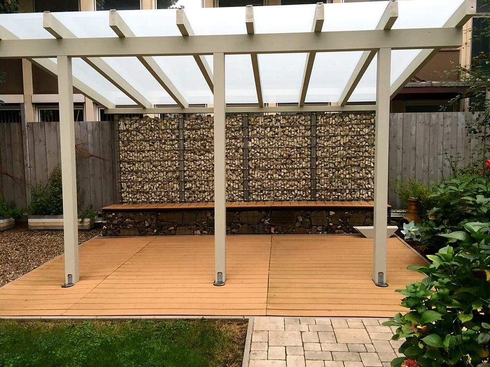 585 m² großer gepflegter Garten, einer modernen, mit einem Glasdach versehenen Terrasse, Gartenschuppen für Fahrräder.