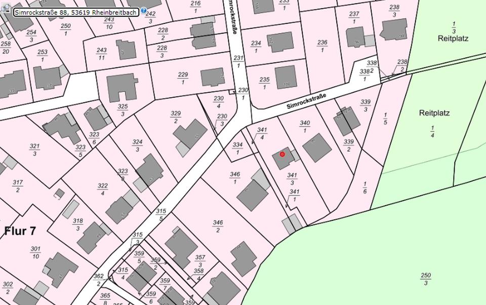 Das Haus liegt am Ende der Simrockstraße – am Anfang einer Sackgasse. Am gegenüberliegenden Ende des Grundstücks beginnt der Wald, der ein Ausläufer des Siebengebirges ist.