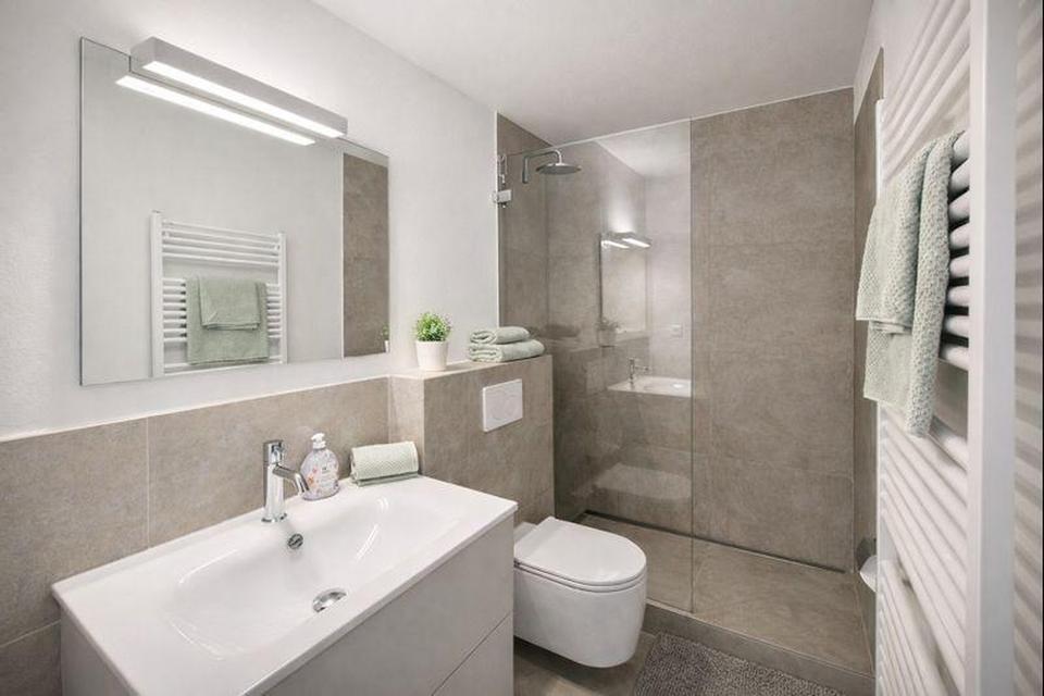 – Modernes Bad mit hochwertigen Fliesen, beleuchtetem Spiegel und Handtuchheizkörper