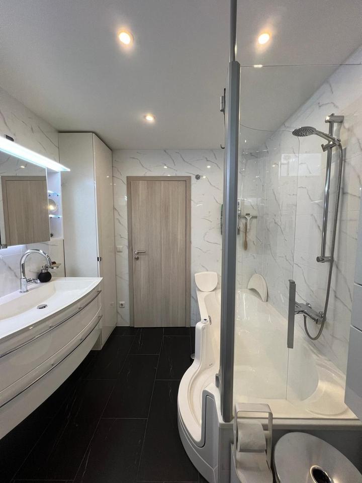 Luxuriös ausgestattetes Tageslichtbad mit begehbarer Badewanne (Artweger) und WC