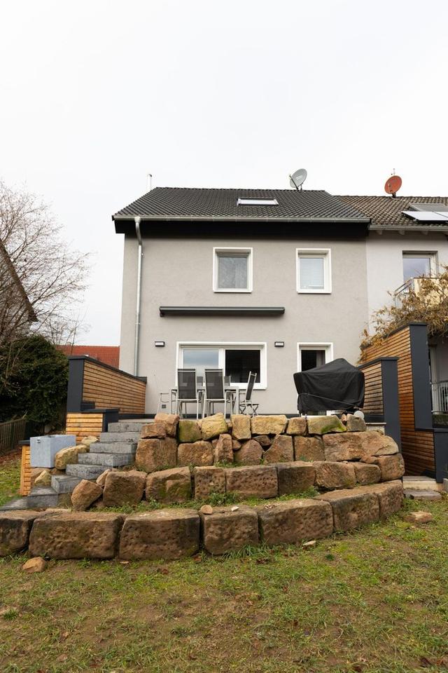 Die dem Wohnzimmer angrenzende neu erstellte Sonnenterrasse ist mit ca. 20m² sehr großzügig ausgelegt und mit optisch beeindruckenden Holzverkleidungen versehen. Ferner wurden im Garten verschiedenste Pflanzmöglichkeiten geschaffen und zur nachhaltigen und kostensparenden Bewässerung, ist eine Regenwasserzisterne mit 5000 l Fassungsvermögen und elektrischer Pumpe installiert.