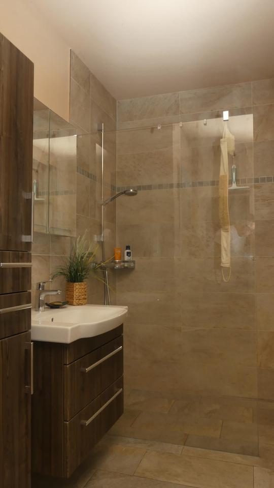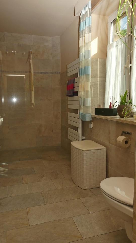 Man gelangt von der Haustür in einen hellen Flur mit der Garderobe und anschließend in die Diele, die durch einen Marmorfußboden besticht. Diese großzügige Diele bietet im EG den Zugang zum 2015 sanierten Bad mit bodenebener Dusche, zum Wohnzimmer mit dem offenen, behaglichen Kamin und zur modernen Küche mit Markengeräten sowie von dort zum Esszimmer.