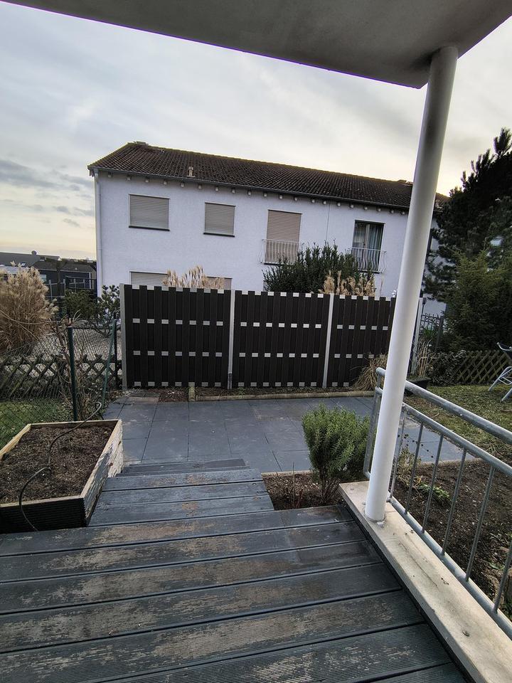 Aus dem Esszimmer treten Sie auf die überdachte erste Terrasse hinaus. Drei Treppenstufen führen weiter zur zweiten Terrasse, die zum Entspannen und Verweilen einlädt. Umrahmt wird der Bereich von einem kleinen Blumenbeet.