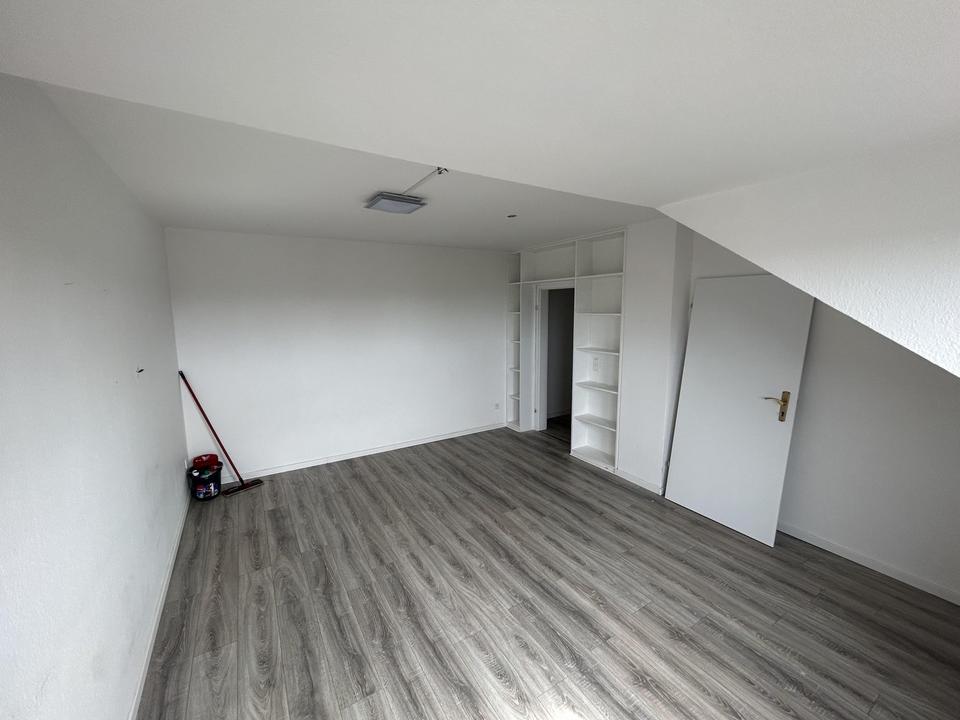 Das helle Wohnzimmer bietet dank der großen Fenster und der Dachschrägen einen schönen Ausblick und eine freundliche Wohnatmosphäre. Hier findet sich ausreichend Platz für eine Wohn- und Essbereichsgestaltung. Das Schlafzimmer ist ebenfalls gut geschnitten und bietet Raum für ein großes Bett sowie Stauraum.
