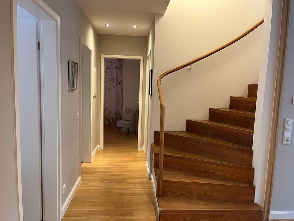 Die ca. 112 m² große Maisonette-Wohnung befindet sich in Hamburg-Lokstedt nahe dem UKE in einer ruhigen Straße, die von Rotbuchen gesäumt ist. Die Wohnung ist hell, gemütlich und sehr gepflegt – ein Ort zum Wohlfühlen und Ankommen. Vom Eingangsbereich mit praktischen Einbauschränken erreichen Sie über den Flur das rund 24 m² Wohn- und Esszimmer mit bodentiefen Fenstern, die für viel Licht sorgen. Hier schließt sich der nach Süden ausgerichtete Balkon mit einer elektrischen Markise an. Gegenüber befindet sich ein Kinderzimmer, das sich auch als Arbeitszimmer eignen würde. Daneben liegt die Küche, die mit hochwertigen Bodenfliesen ausgestattet ist und über eine moderne Einbauküche verfügt. Das gegenüberliegende Duschbad ist geräumig und bietet durch einen Einbauschrank Platz für eine Waschmaschine. Neben dem Bad befindet sich ein weiteres, gemütliches Kinderzimmer. Die Holztreppe führt in ein ca. 26 m² großes Zimmer mit sehr hohen Decken und Velux-Fenstern, das momentan als Schlafzimmer genutzt wird. Hier schließen sich ein Ankleidezimmer, ein weiteres Bad und ein Abstellraum an. Die gesamte Wohnung verfügt über Fußbodenheizung. Im Kellergeschoss gibt es eine Waschküche mit Platz für Waschmaschine und Trockner. Die großzügige Tiefgarage beinhaltet einen Tiefgaragenstellplatz für jede Wohneinheit und bietet Abstellmöglichkeiten für z. B. Kinderwagen oder Lastenräder.