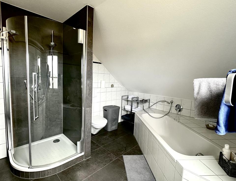 3 Schlafzimmer, Bad mit Dusche, Badewanne, WC und zwei Waschbecken