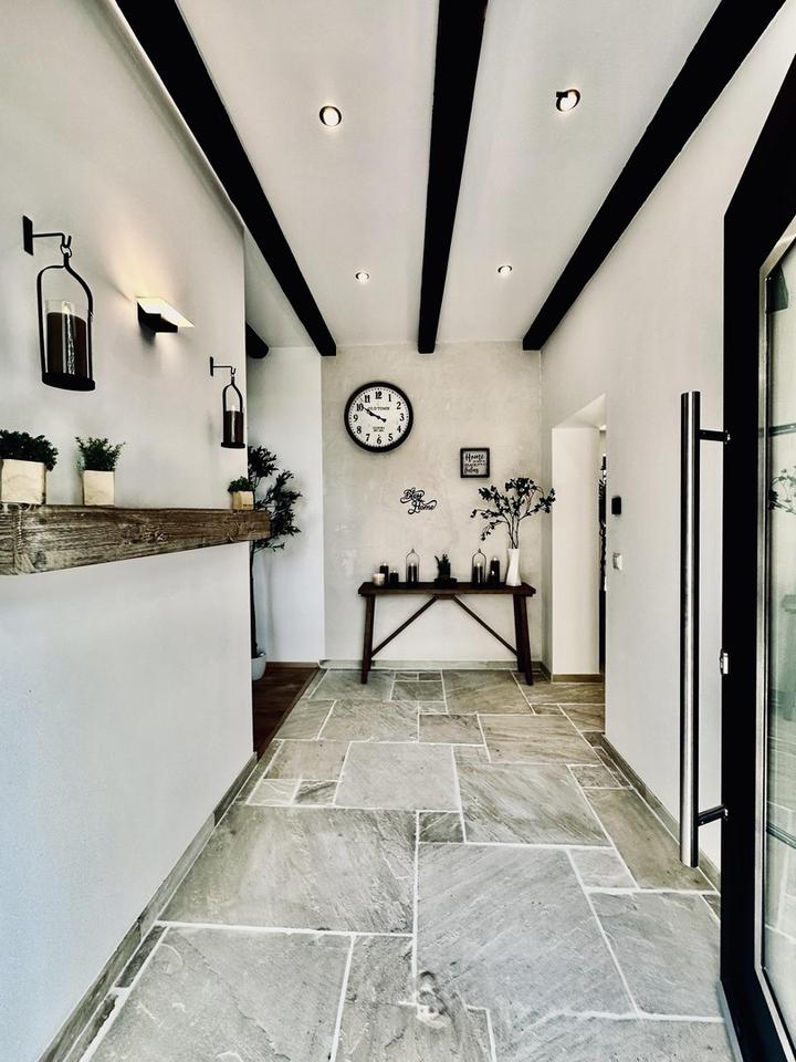 +Massivparkett Eiche + Naturstein-Akzente – hochwertige Materialien