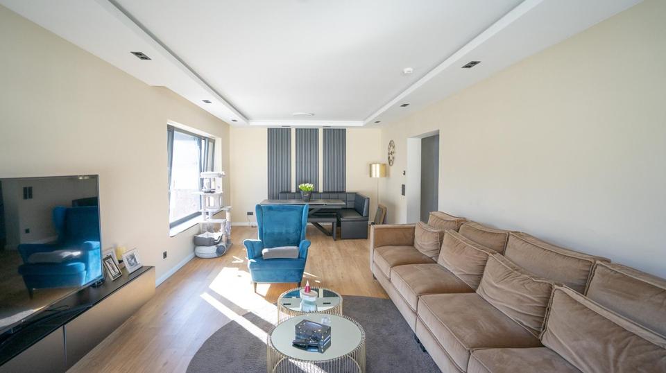 Die hochwertige Küche der Marke Leicht, der glatte Innenausbau mit gespachtelten Wänden, Zimmertüren und Vinylböden schaffen ein modernes und