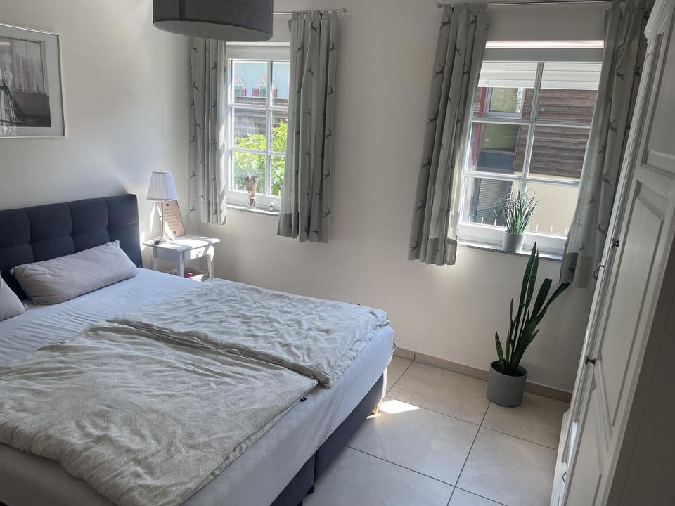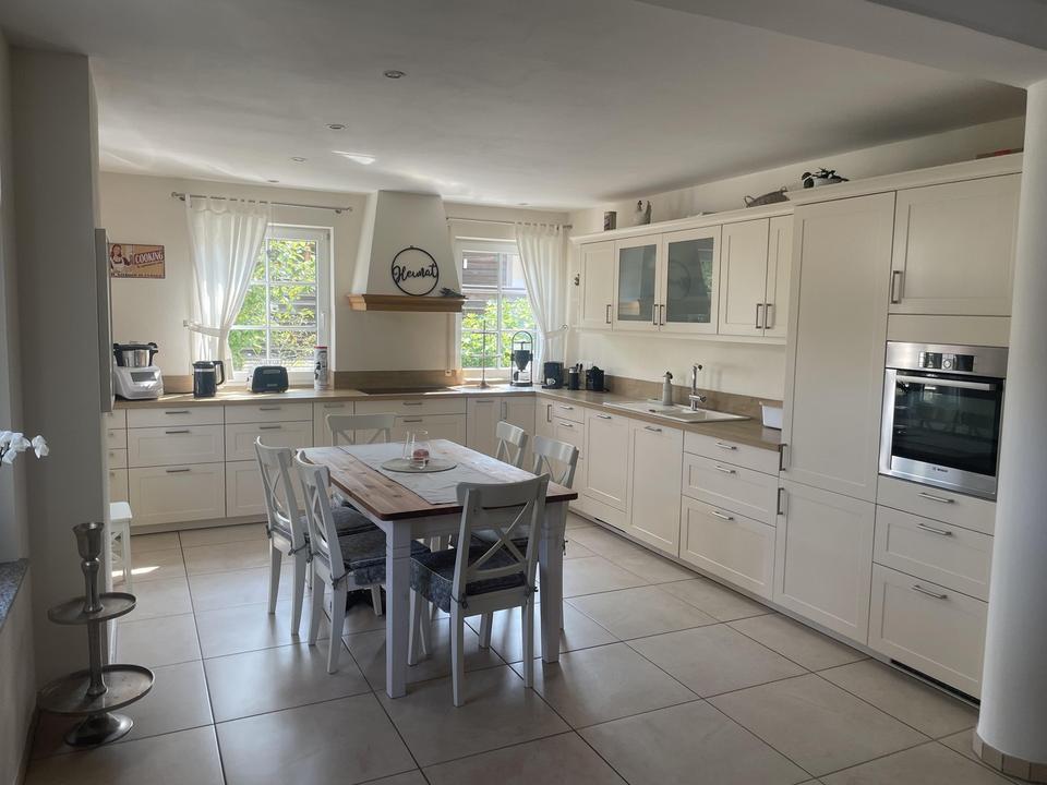 In der Wohnung selbst sind insbesondere sie abgehängten Decken mit integrierter Beleuchtung in allen Räumen sowie das luxuriöse Bad mit Wanne und bodenebener Regendusche hervorzuheben. Weitere Highlights sie der zentral gelegene große und formschöne helle Kachelofen sowie die hochwertige Küche mit Holz-Arbeitsplatte und Marken-Elektrogeräten.