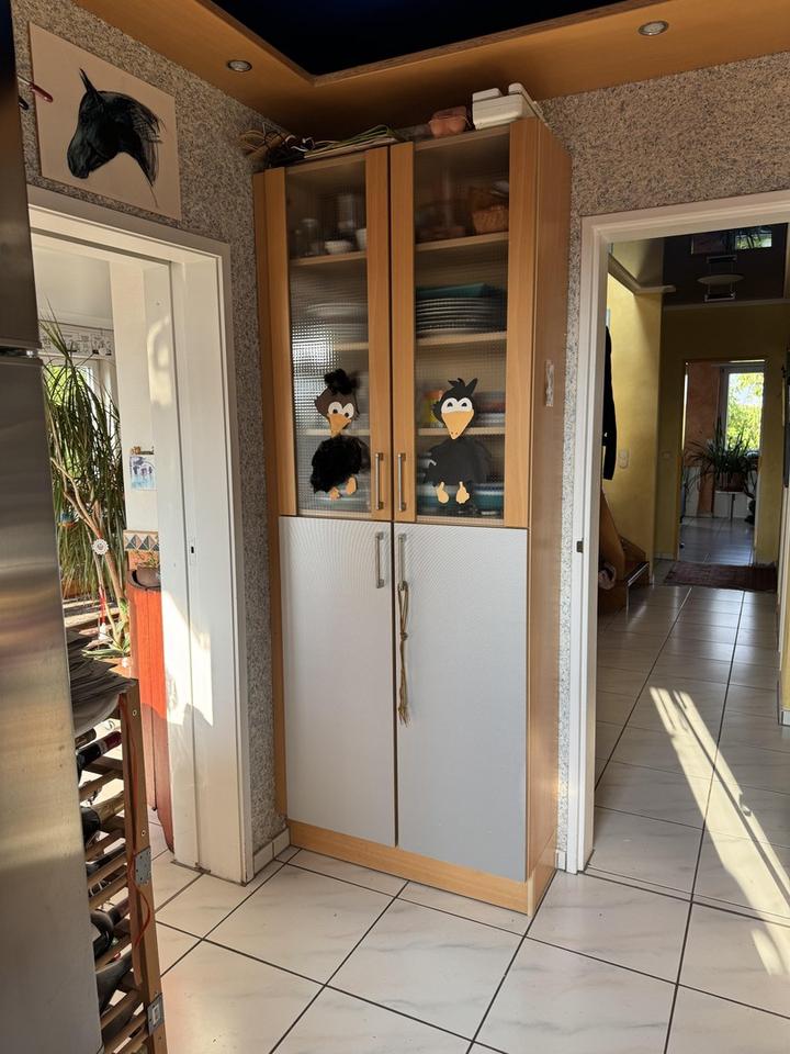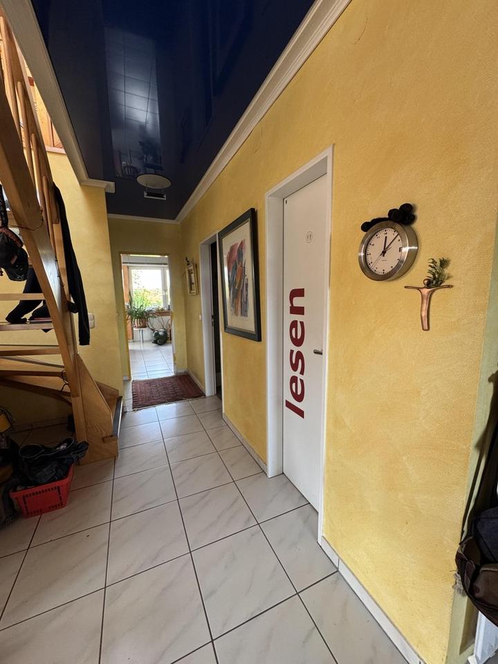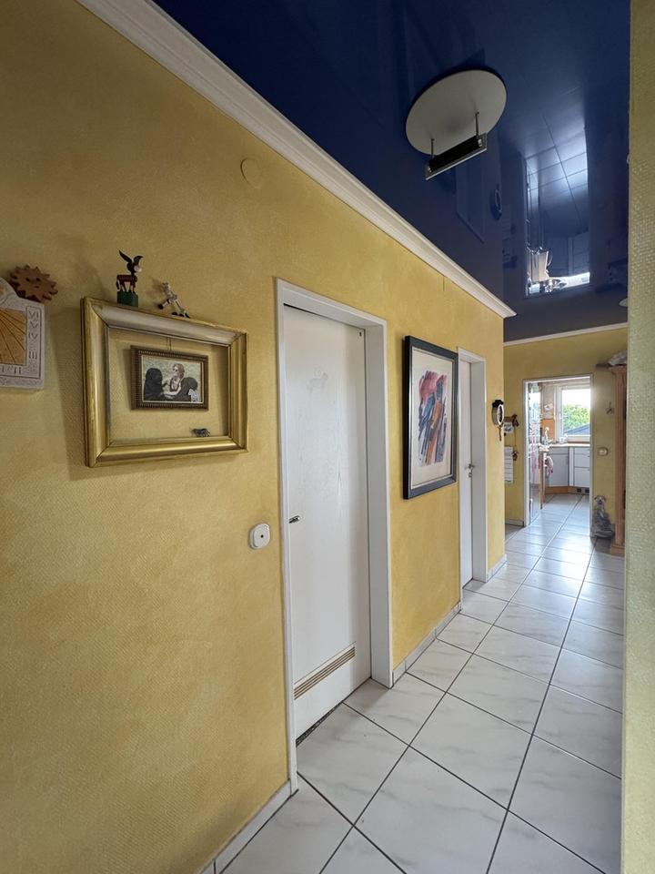 Die Böden im 2. OG sind einheitlich hell gefliest, darüber hinaus sind der Flur, die Küche sowie der Wohn-und Essbereich mit dekorativen Lackspanndecken ausgestattet. Die Türen der Küche und des Arbeitszimmers sind aus Sicherheits-Glas, alle anderen Türen und Zargen sind in Holzoptik weiß ummantelt.
