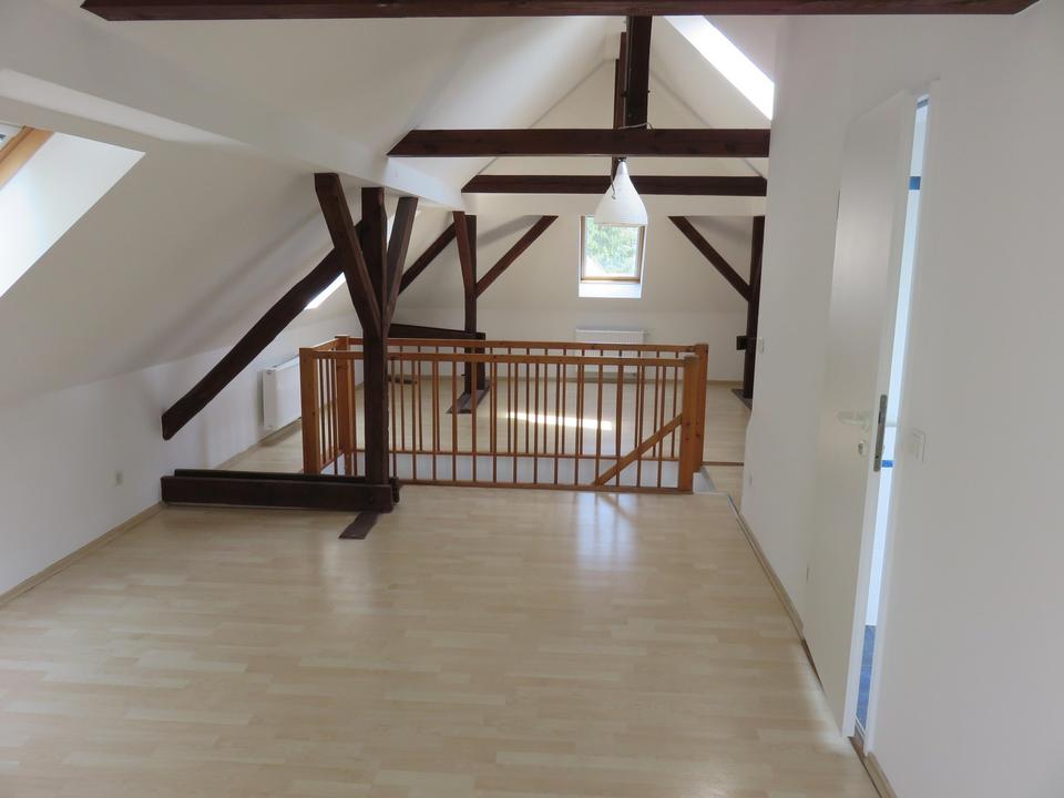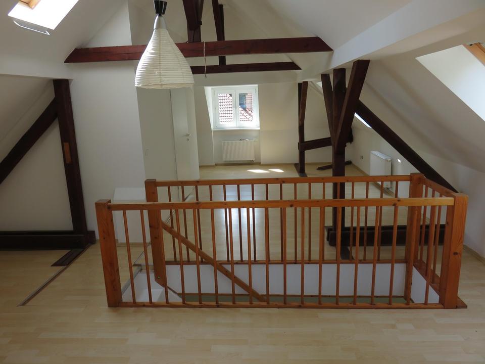 Das Dachgeschoss ist hell belichtet und bietet eine große, sehr gemütliche Wohnfläche, welche durch das sichtbare Dachgebälk geprägt ist. Im Dachgeschoss befindet sich ein weiteres Badezimmer mit Dusche und WC.
