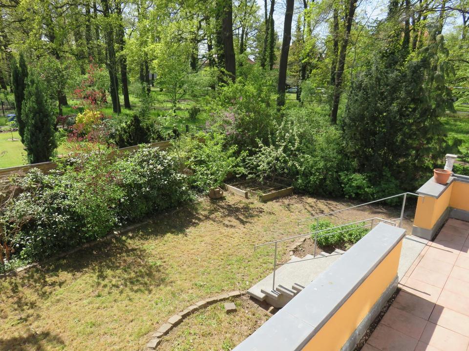 Der Garten ist vergleichsweise klein und damit pflegeleicht. Eingebunden ist diese Villa in den angrenzenden Parkstreifen mit großen Bäumen und einem schönen Spazierweg, der direkt in den Spandauer Forst führt.