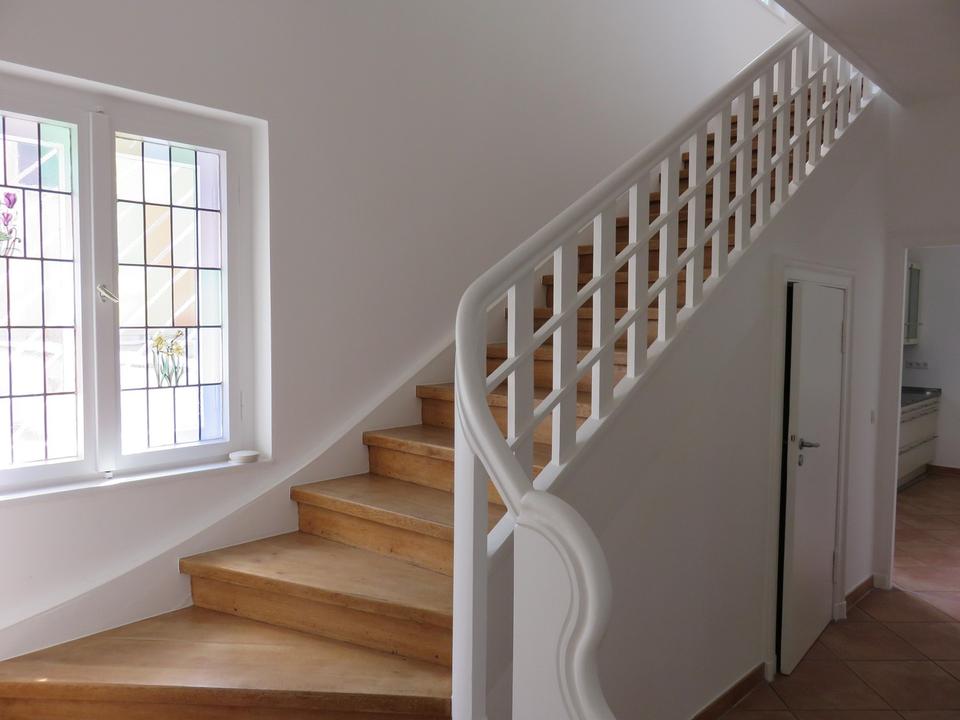 Gleich am Windfang befindet sich das Gäste-WC und vom hellen Hausflur in der Belletage aus, gelangen Sie vorbei an handverglasten Fenstern in das Obergeschoss bzw. in das große Wohnzimmer mit Kaminofen, das Club- oder Lesezimmer sowie geradeaus in die große Küche. Von der Küche und vom angrenzenden Essbereich aus gelangen Sie auf die sehr große Terrasse in der Ebene der Belletage.