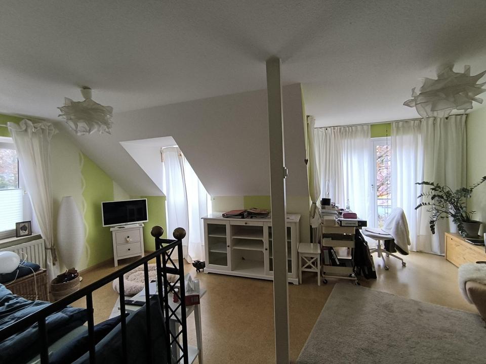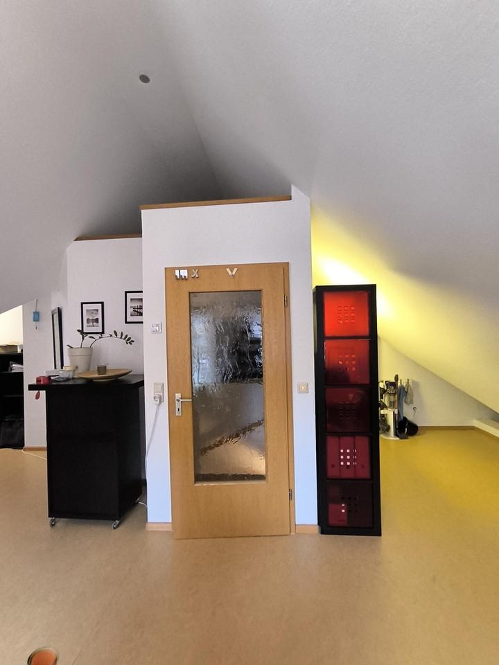 Linoleumfussboden im DG-Studio. Dort befindet sich eine kleine Teeküche mit Kühlschrank.