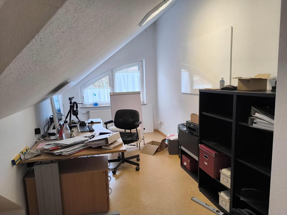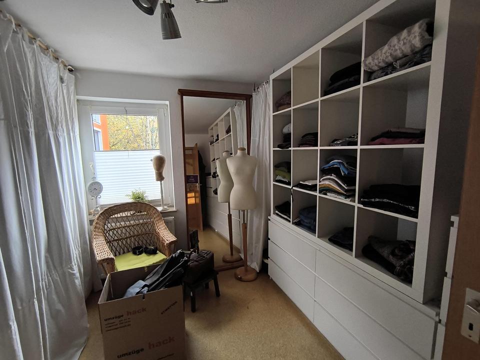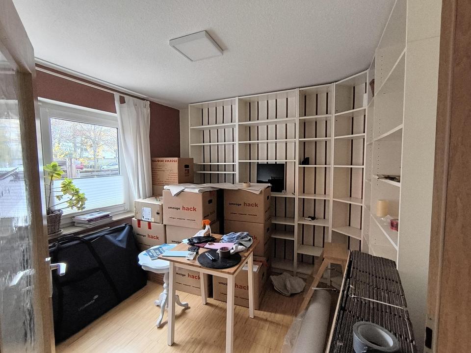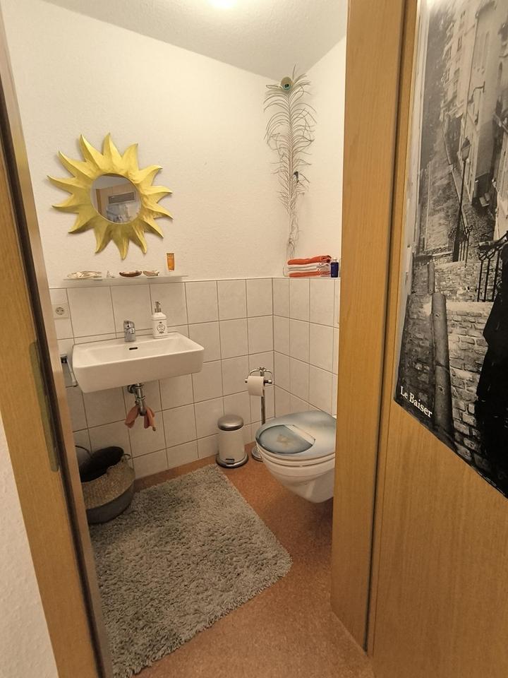 Korkfussboden im OG. Der kleinere der drei Schlafräume im OG hat an der linken Wand vorbereitete Küchenanschlüsse (wurden nie genutzt). Dort befindet sich die Bosch-Smart-Home-Steuerungseinheit für die Funkfernsteuerung sämtlicher Heizkörperthermostate im Haus. Das Badezimmer ist hell gefliest, verfügt über ein großes Doppelwaschbecken, Badewanne und separate Dusche.