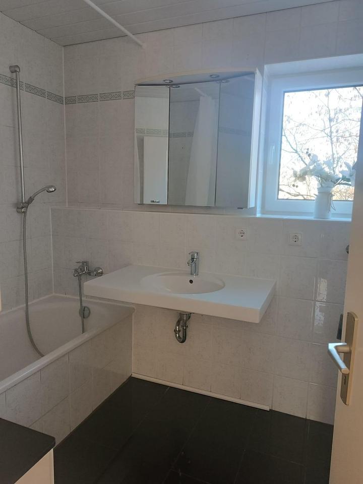 Alle Räume verfügen über große Fenster, ebenso das Bad (komplett gefliest) mit Badewanne, Waschmaschinen-Anschluß, weißer Holzdecke und schwarzen Boden-Lackfliesen.