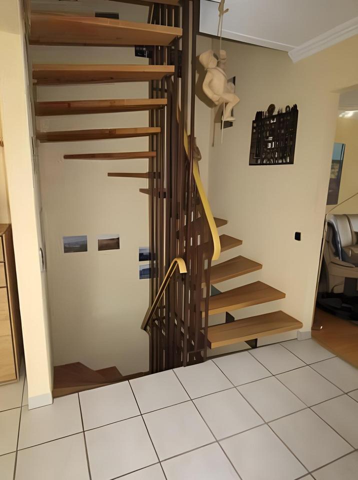 Eine moderne schöne Holztreppe führt ins Obergeschoss. Hier befinden sich ein großes Schlafzimmer und zwei Kinder-/Arbeitszimmer in voller Höhe (ganz minimale Schrägen), eine Abstellkammer sowie ein großzügiges Bad mit begehbarer Dusche.