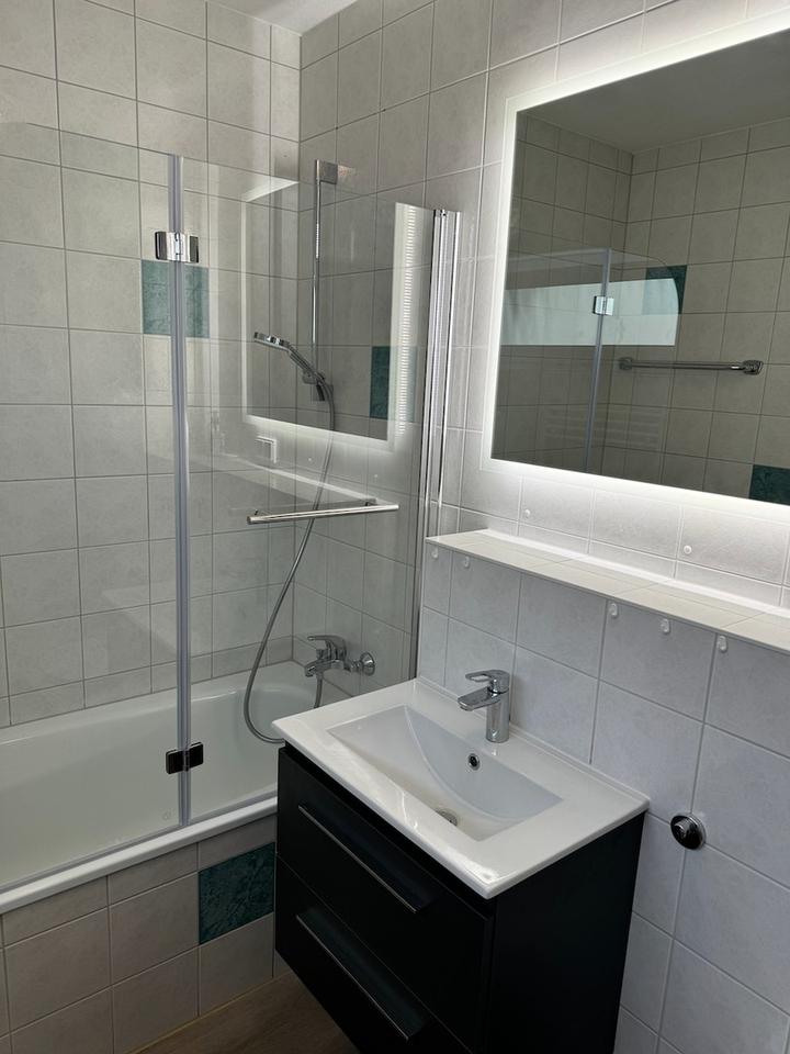 Das Tageslichtbadezimmer mit Badewanne, WC und Waschbecken erfüllt alle Morgenrituale – alles griffbereit für pure Bequemlichkeit.