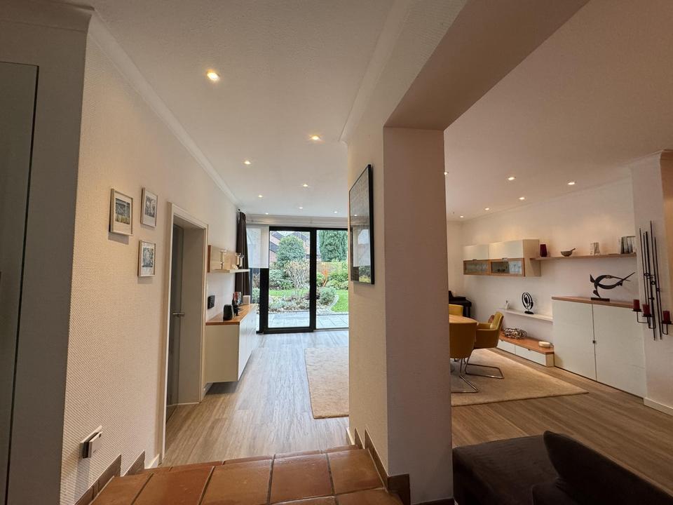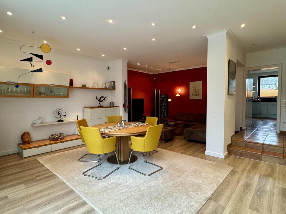 Das in zwei Teilbereiche unterteilte Wohnzimmer und das angrenzende Kaminzimmer beeindrucken mit einer imposanten Raumhöhe von 2,86 Metern, die für eine außergewöhnliche Weite sorgt – ein Merkmal, das man sonst eher in Villen oder Altbauwohnungen findet. Die bodentiefen Fenster öffnen den Raum zum Garten und lassen diesen fast nahtlos mit dem Innenbereich verschmelzen, so dass der Garten fast zu einem Teil des Raumes wird.