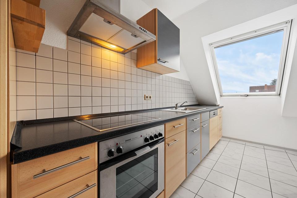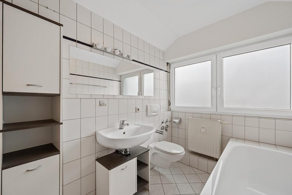 Die Küche ist bereits mit einer funktionalen Einbauküche versehen. Das Badezimmer verfügt sowohl über eine Badewanne als auch über eine separate Dusche. Ein Fenster sorgt hier für natürliches Licht und optimale Belüftung.