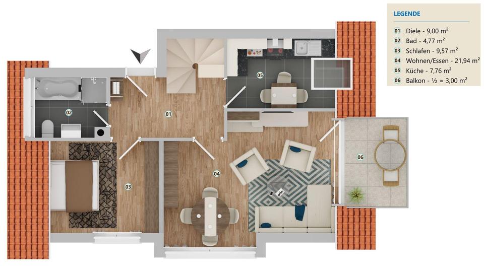 Die Ausstattung dieser Maisonette-Wohnung überzeugt durch Qualität und ein durchdachtes Konzept. In den Wohnräumen wurde ein zeitloser Parkettboden verlegt. Die Schlafräume sind mit pflegeleichten Laminat ausgestattet.
