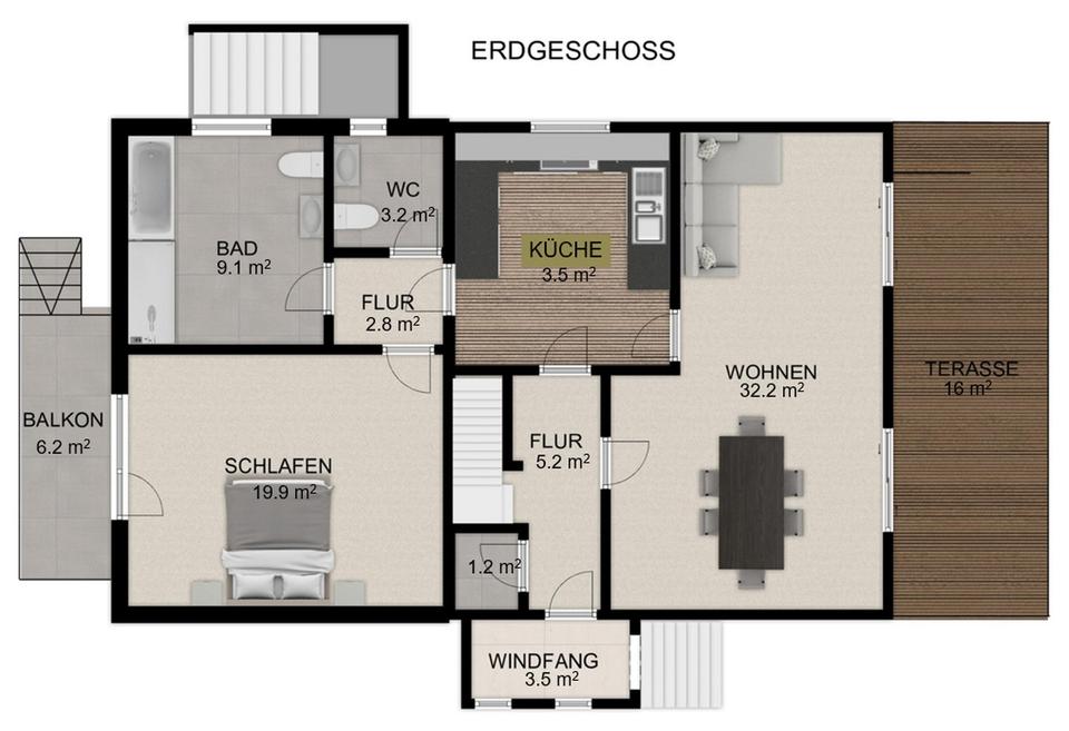 • Drei Badezimmer und separates Gäste-WC für Komfort und Privatsphäre.