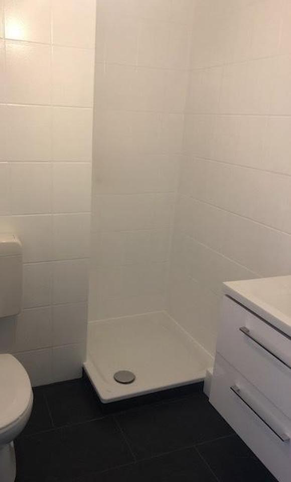 Die Wände sind frisch tapeziert und gestrichen, der Wohnbereich ist mit hochwertigem Laminatboden ausgestattet. In der Küchenecke und im Bad wurden moderne, schwarze Bodenfliesen verlegt; die Wandflächen sind mit zeitlosen, weißen Fliesen versehen und sorgen für ein helles, elegantes Ambiente.