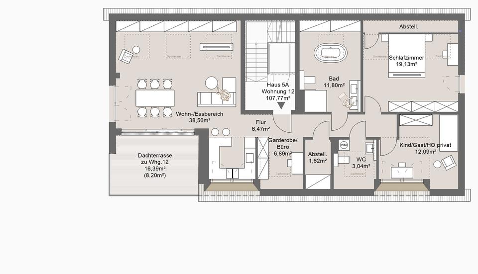 Die Penthouse-Wohnung hat eine tolle Dachterrasse mit tollem Ausblick, exklusive Badausstattung, u.a. eine freistehende Badewanne und ein zusätzliches Gäste-WC