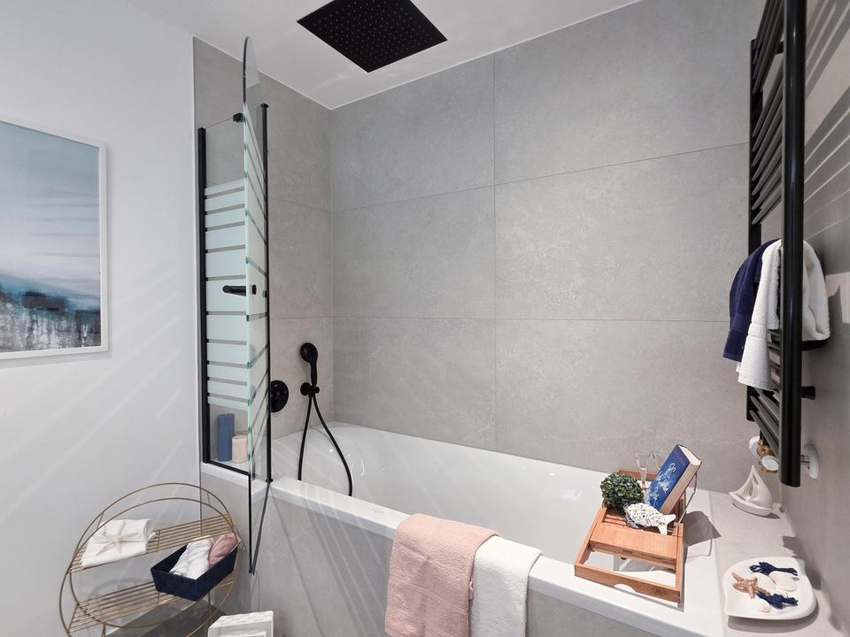 Dieses Design-Badezimmer verbindet modernen Wohnkomfort mit exklusiver Ausstattung. Unterputz-Regendusche und Armaturen im „Black Design“ und die großzügige Waschschale setzen einen stilvollen Akzent und verleihen dem Raum eine außergewöhnliche Note.