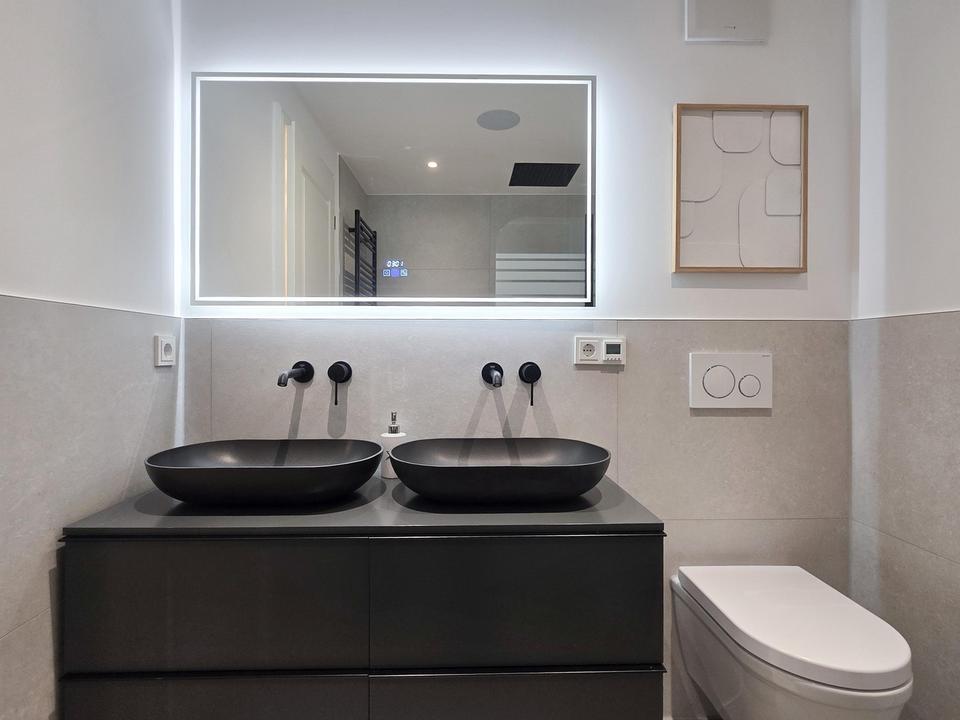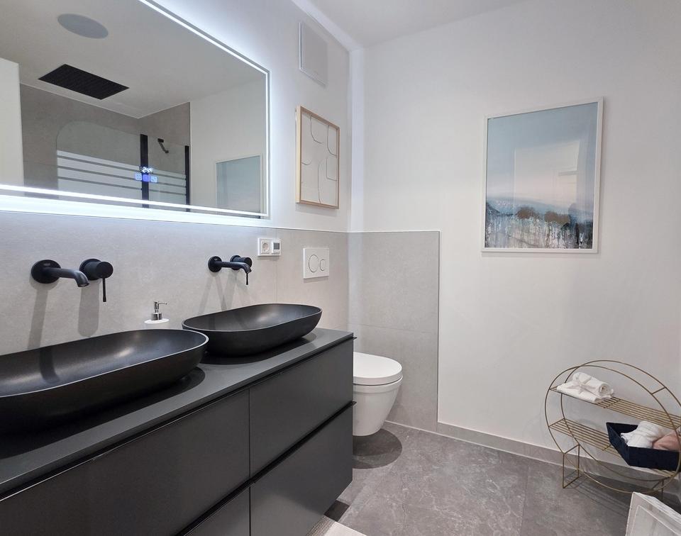 Die großzügige Badewanne mit hochwertigen Unterputzarmaturen von Grohe elegante Rainshower-Deckendusche, Wandheizkörper im modernen „Black-Design“, Doppelwaschtisch, geschmackvolle Wandarmaturen, Softclose-Unterschrank, LED Badspiegel sowie Bluetooth-Lautsprecher lassen dieses Bad zur Wellness-Oase werden. Eine elektr. Fußbodenheizung unterstützt das Wohlbefinden.