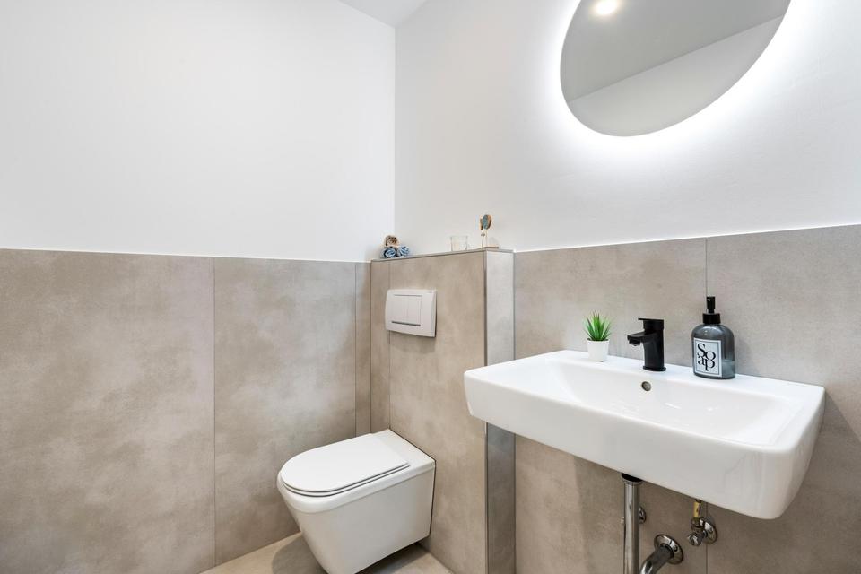 Das moderne Vollbad ist mit neuen Sanitärobjekten und Armaturen sowie neuen großformatigen Fliesen ausgestattet, zusätzlich gibt es ein separates Gäste-WC.