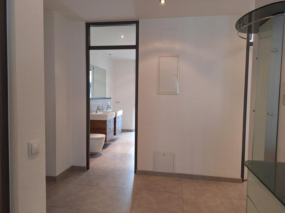 Das Badezimmer verfügt über eine Badewanne, eine Dusche mit Kabine, ein WC, zwei separate Waschbecken, einen großen Handtuchheizkörper und einen Waschmaschinenanschluss. Zudem besitzt die Wohnung ein kleines Gäste-WC mit Waschbecken.