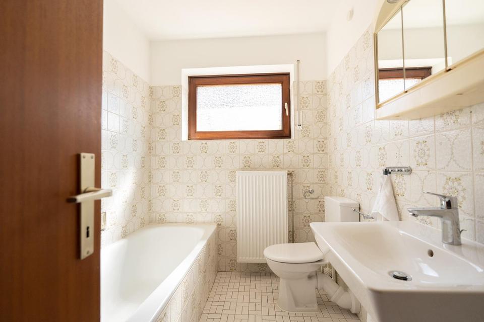 Das Tageslicht-Badezimmer verfügt über Waschbecken, WC sowie Badewanne und Dusche mit Duschabtrennung und Regendusche mit Thermostatsteuerung.