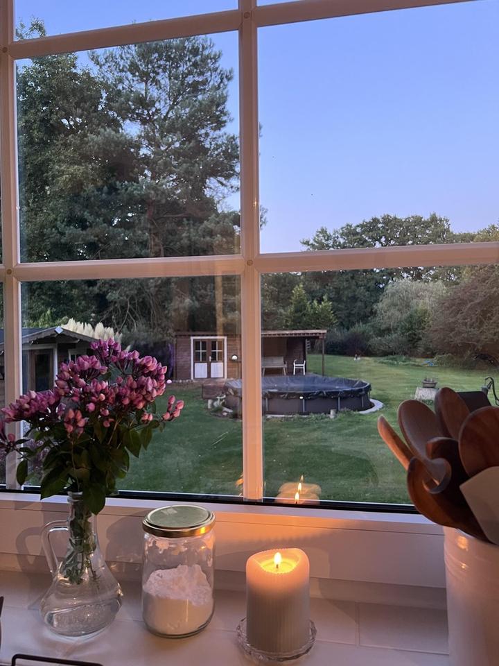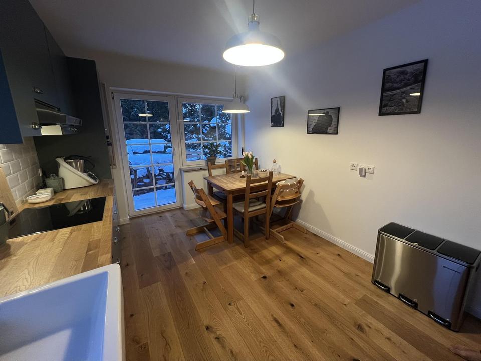 Von der behaglichen Wohnküche aus, mit Blick in den Garten, gelangen Sie direkt auf die Terrasse. Diese eröffnet Ihnen aufgrund ihrer erhöhten Lage einen herrlichen Blick über den wunderschönen Garten.