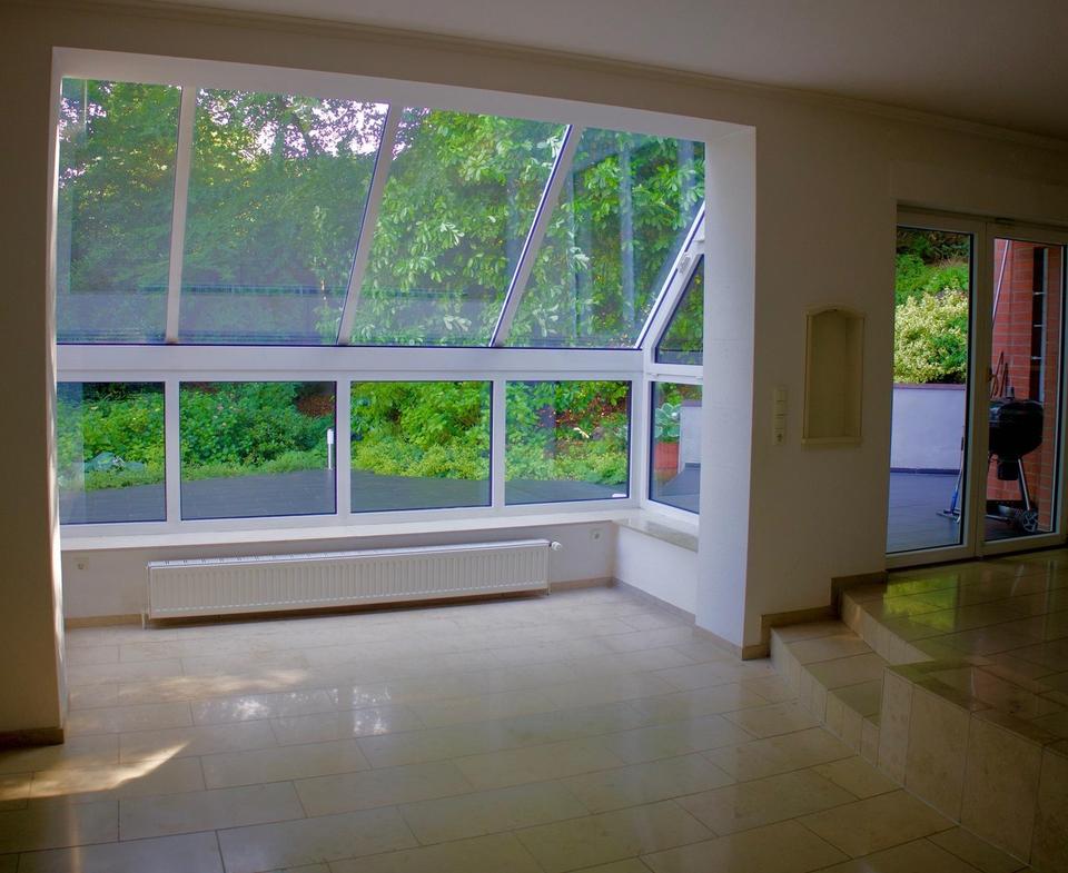 Im hellen und freundlichen Wohnzimmer mit mehreren Ausgängen auf die Terrasse genießen Sie viel Licht und einen direkten Zugang in den Garten. Ein wintergartenartiger Ausbau ist harmonisch in den Wohnbereich integriert und schafft zusätzliche Wohnqualität.
