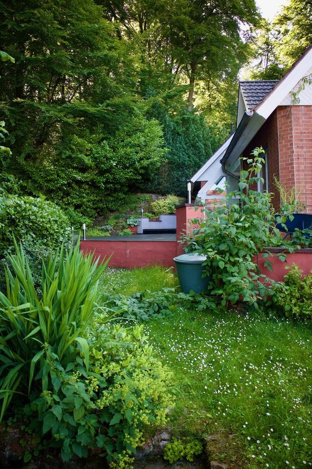 Komplett angelegter Garten mit einem kleinen Naturbachverlauf.