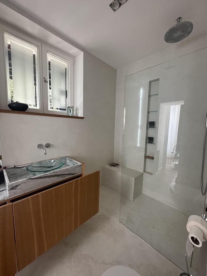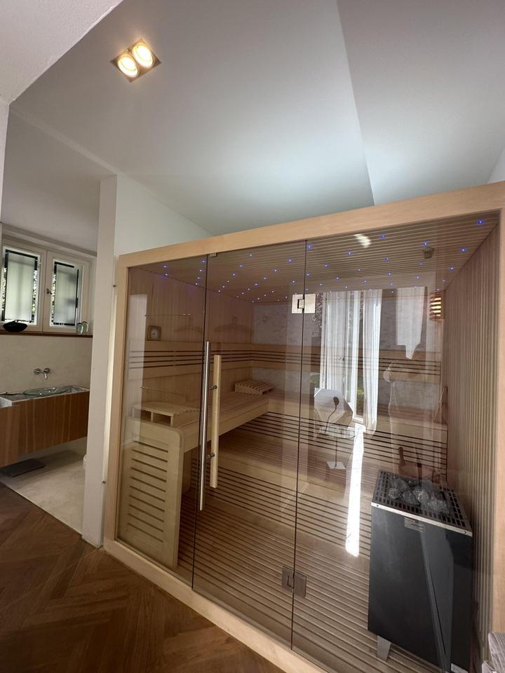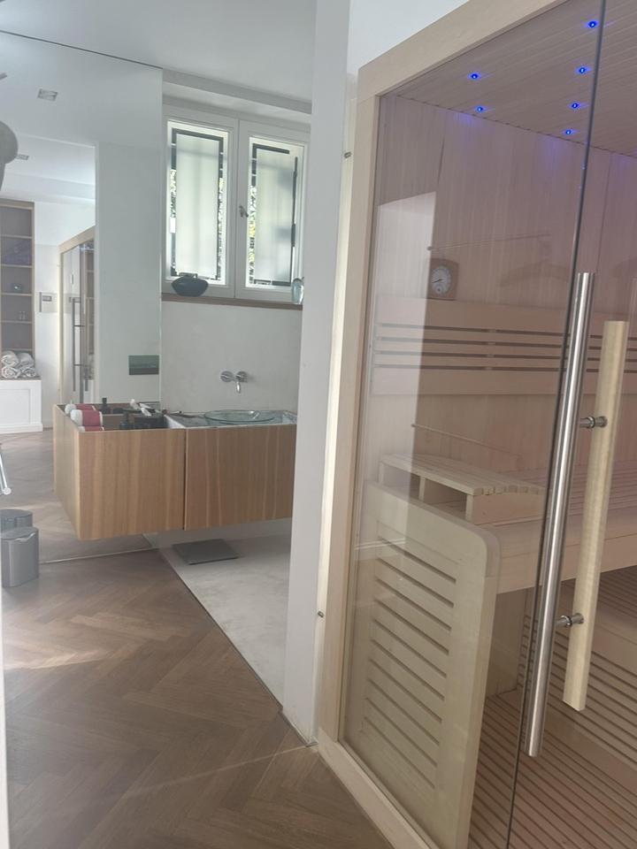 Ein besonderes Highlight ist das luxuriöse Badezimmer, das direkt an das Schlafzimmer angrenzt. Es verfügt über eine geräumige begehbare Dusche mit eigener Sauna, die Ihnen Momente der ultimativen Entspannung bietet.
