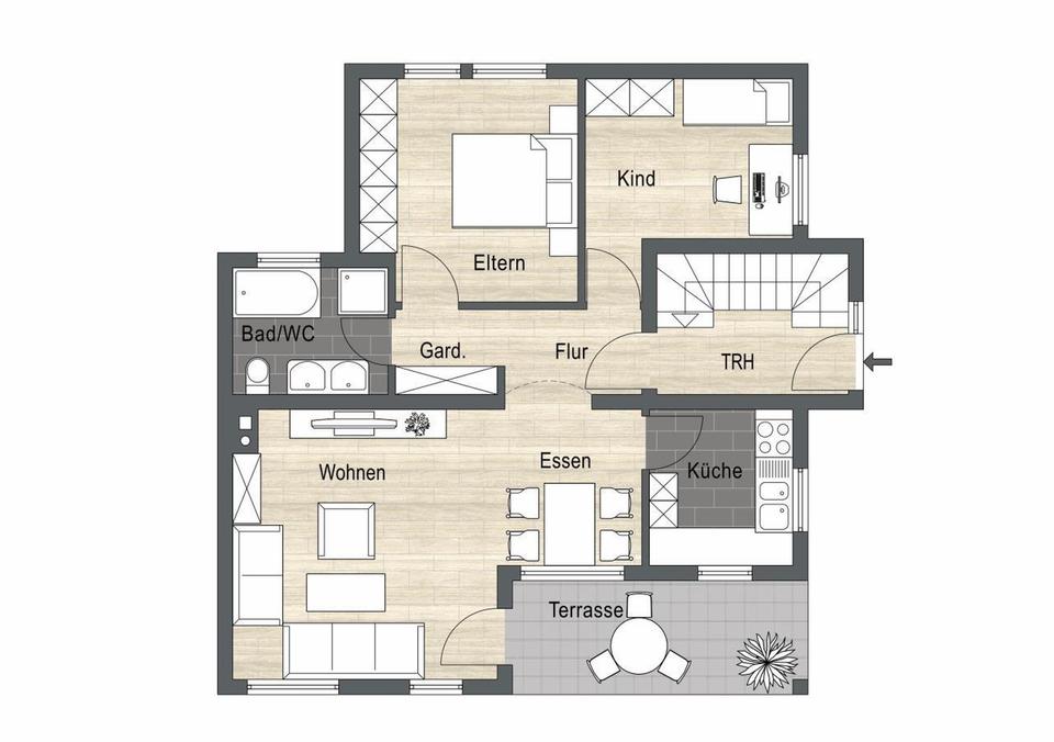 Balkon, Terrasse, Garten, Keller, Vollbad, Barrierefrei, Parkett, Fliesen