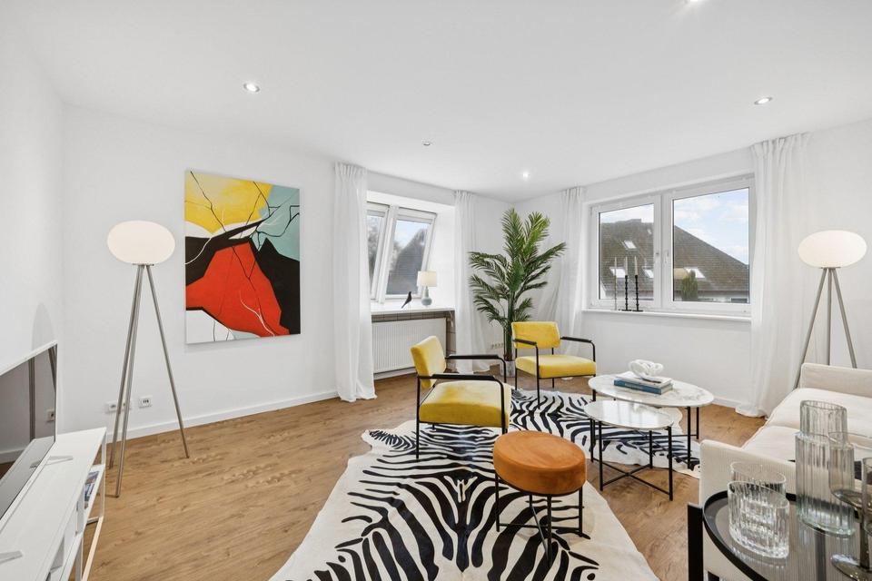 Im EG befindet sich eine 2025 ausgebaute, barrierearme Wohnung mit großer Südfensterfront, modernem Bad und Terrasse zum rückwärtigen Innenhof. Der offene Grundriss bietet an, weitere Zimmer abzutrennen.