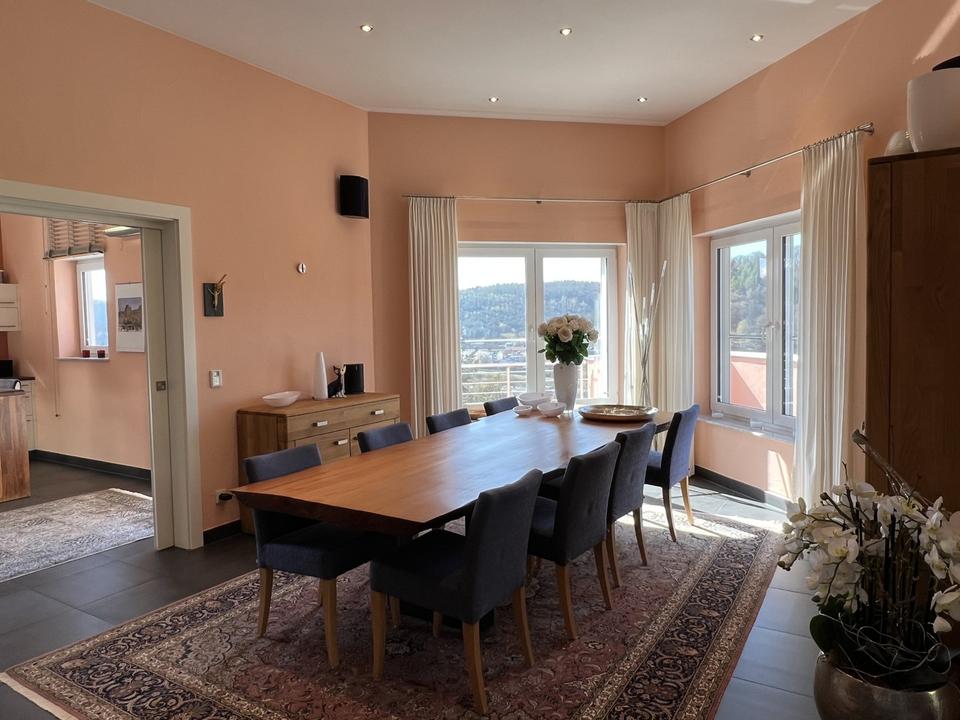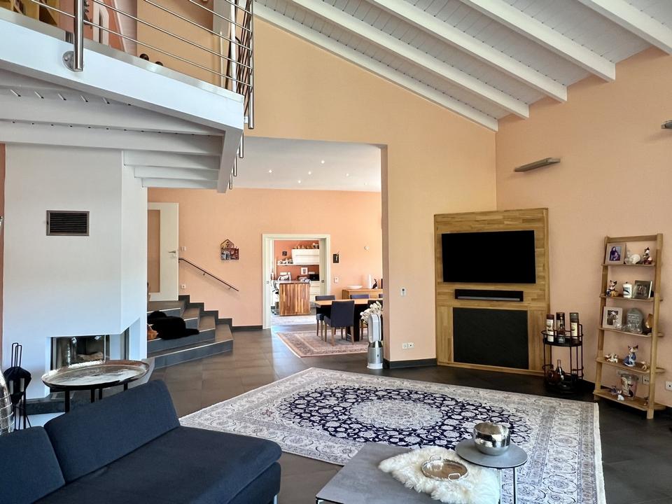 Im Erdgeschoß empfängt sie ein großer Eingangsbereich. Hier befindet sich die große, moderne Wohnküche mit Zugang zum Südbalkon und herrlichem Blick über die Stadt, das geräumige Wohn-/Esszimmer mit großem Kamin, ebenfalls Zugang zur Terrasse/Garten, sowie zwei weitere Zimmer, Gäste-WC und ein Abstellraum.
